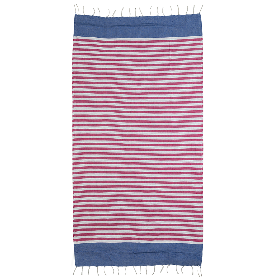 Printed beach fouta topped with fringes. Your essential summer complement. Two in 1, on the one hand you have the striped pattern that serves as a fouta and on the other the absorbent towel that will dry you after a dip in the sea. Composition: 50% cotton, 50% polyester. Measurements: 180 x 90cm