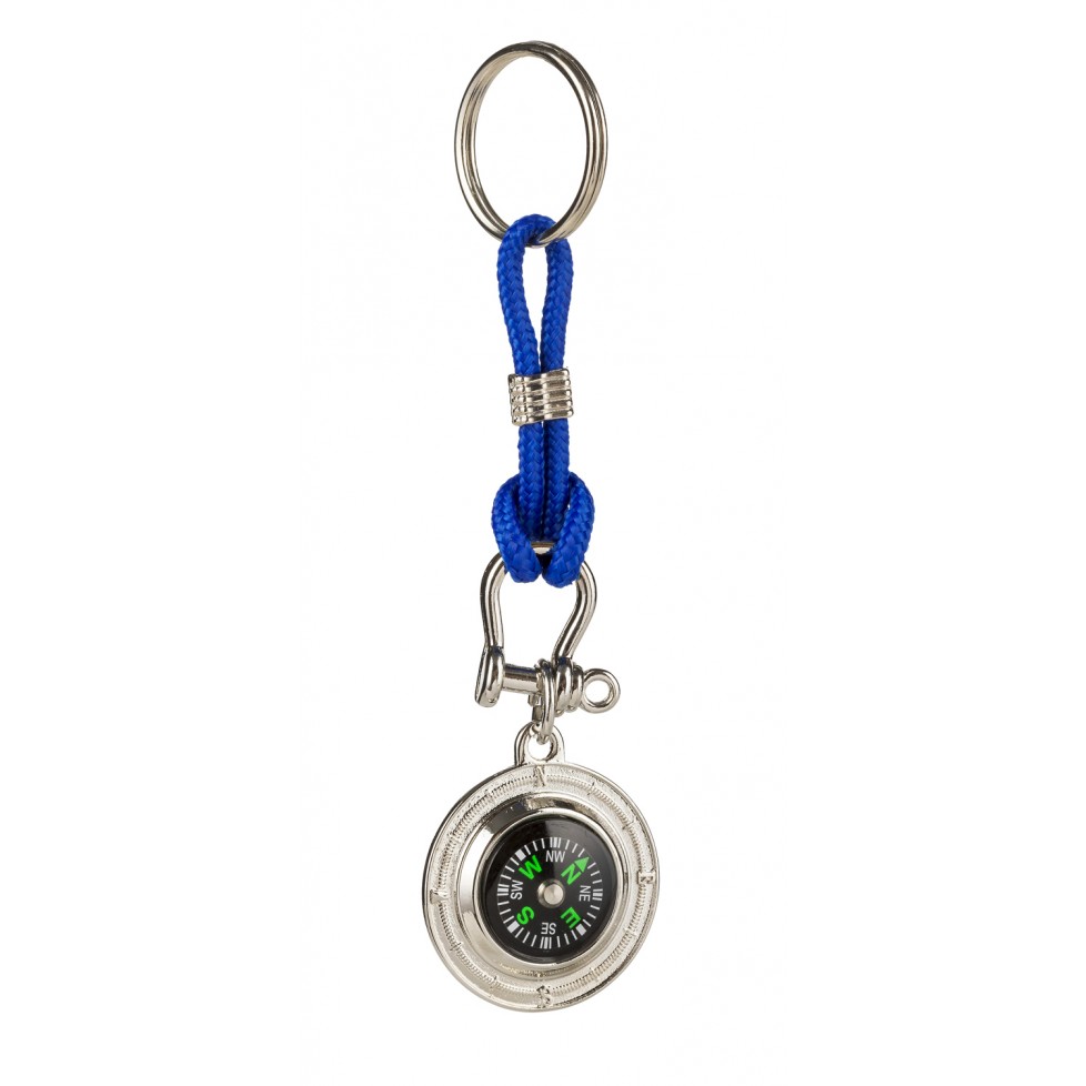 Nautical keychain pocket compass. Made of nickel, tied by a carabiner with a navy blue rope and mounted with a hoop.