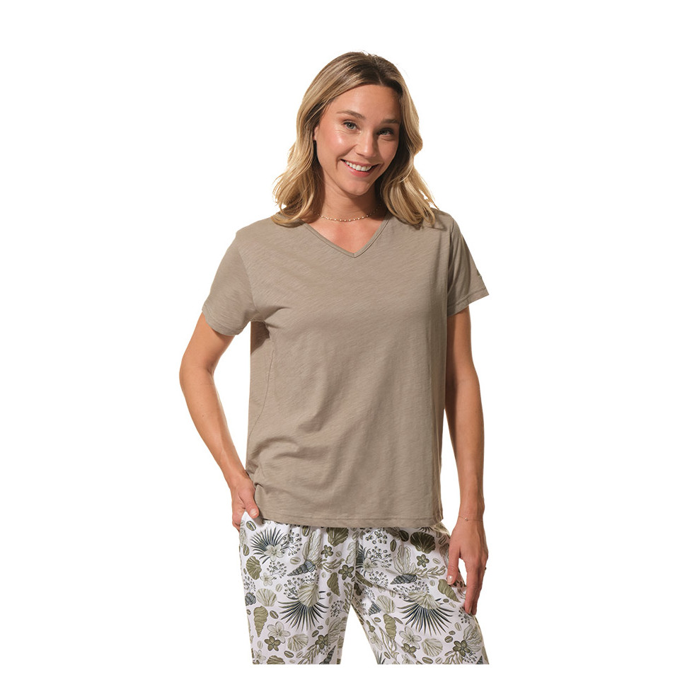 Confectionnée en 100 % coton, sa matière offre une texture douce avec un esprit naturel et décontracté. Elle dispose de manches courtes et d’un col en V.