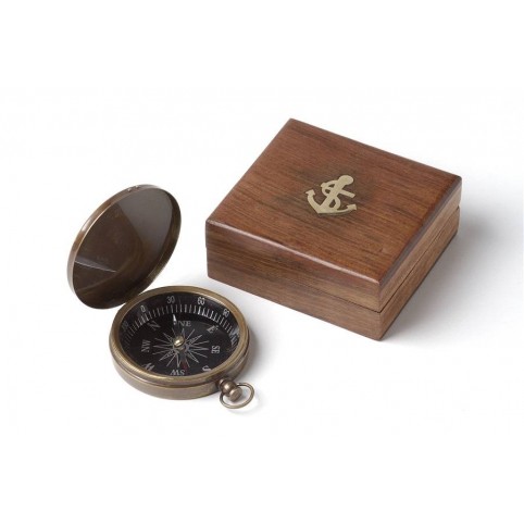 Decorative compass in antique brass finish. It includes a sheesham wood box decorated with an anchor in brass.