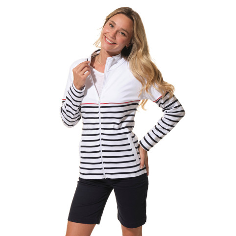 Elegant and femenine nautical jacket, both sporty and comfortable. Closes with a zip. Composition: 100% cotton.