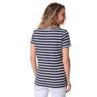 Women's nautical short sleeved t-shirt, with navy blue and white stripes with an elegant squared neck. Composition : Jersey 95% Cotton - 5% elastane.