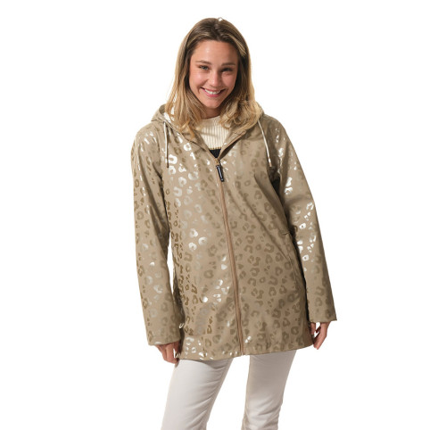 Women's nautical raincoat in navy blue with inner lining. Double closure with zipper and pressure buttons. Ajustable hood.
