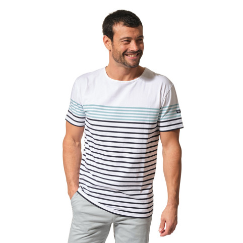 Women's nautical white and navy blue striped shirt, with 3/4 length sleeves and v-neck. Composition : 100% Cotton.