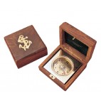 Brass compass with dial mounted in a acacia wood box with anchor motif.