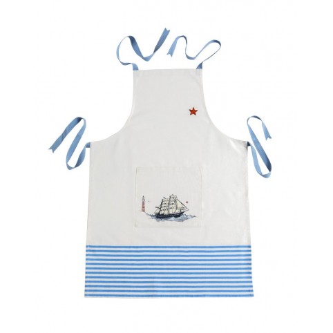 Delantal de cocina de estilo marinero con un bolsillo estampado con el mítico velero BELEM, homenaje a uno de los yates mas antiguos del mundo. Talla única. Composición : 100% algodón.