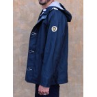 Para los inviernos fríos y lluviosos, chubasquero impermeable para mujer de color azul marino de la marca HUBLOT MODE MARINE. Se cierra con cremallera y botones a presión. Capucha desmontable. Forrado con jersey de rayas azul marino y blancas. Composición : 100% Poliuretano, doblado en el interior con jersey de rayas.