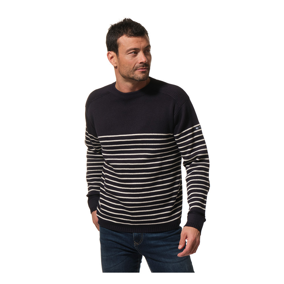 Jersey de rayas azul marino y blanco de cuello redondo para hombre. Un clásico marino que no puede faltar en tu armario.