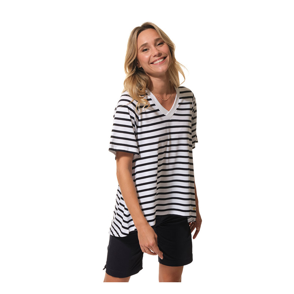 La camiseta perfecta para cualquier día: fresca, cómoda y con estilo náutico. Con su diseño de rayas blancas y azul marino, esta camiseta de manga corta, corte oversize y cuello en V te encantará. Ideal para los días cálidos, ¡y combina con todo!