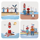 Cada posavasos está adornado con una ilustración de temática náutica que combina elementos como las gaviotas, casetas de playa, barcos veleros y pesqueros y faros.