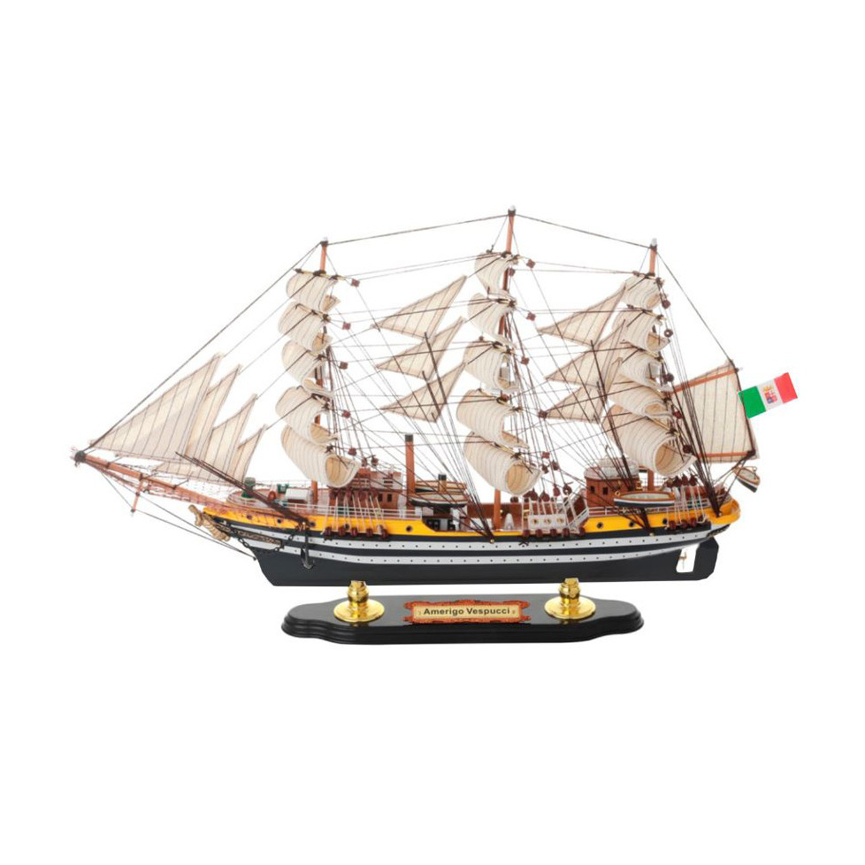 Esta maqueta decorativa se presenta sobre una elegante peana y contiene una placa con "Amerigo Vespucci". Es ideal para amantes del mar o quienes buscan un toque de elegancia atemporal en su hogar.