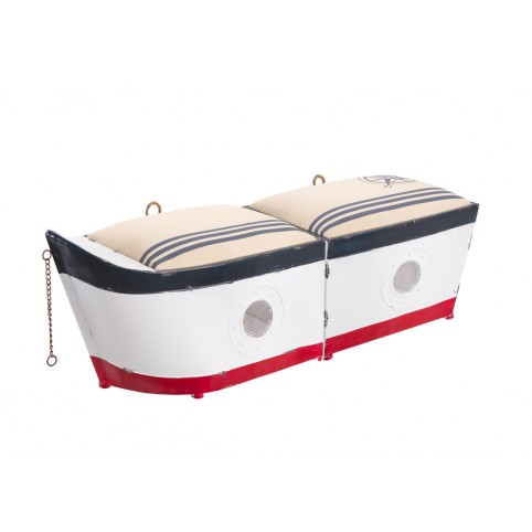 Banquette barque composé de deux modules séparés. Les sièges rembourrés se lèvent laissant apparaître deux coffres pour ranger vos affaires. La banquette-bateau est en métal peint à la main d'aspect rustique.