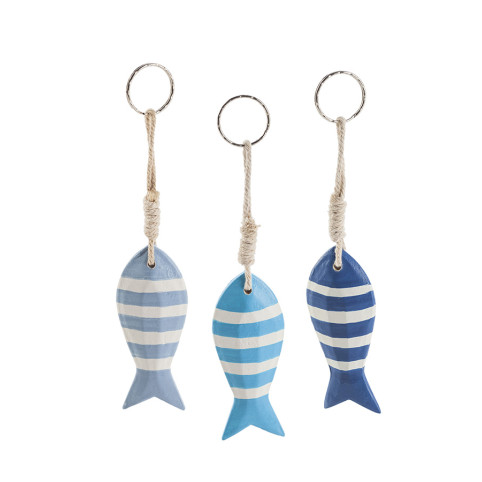 Set de 3 porte-clés en forme de poisson, réalisés en bois avec une finition rustique et peints dans différentes nuances de bleu avec des rayures marines. Chaque poisson est relié à l’anneau métallique par une corde en coton. Un détail pratique et décoratif, idéal pour les amoureux de la mer ou comme petit cadeau au style côtier. Le prix indiqué...