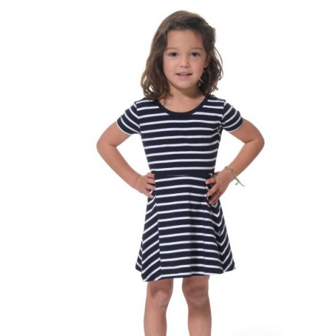 Robe fille manches courtes de style marin à rayures blanches et bleu marine sur la partie haute et bleu jean sur la partie inférieure. Magnifique! Composition : 94% coton, 3% polyester, 3% polyamide.