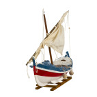 Maquette décorative THONIER BRETON réalisée en bois peint et entièrement montée de façon artisanale. Le thonier (XIXe s.), a été construit spécialement pour la pêche au thon. Il apparaît en Bretagne et reste le symbole de la tradition maritime. La forme si particulière de la coque et les voiles permettait aux pêcheurs de tenir en haute mer et pouvoir...