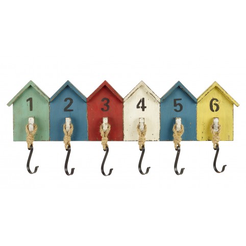 Tout en couleurs ! Dans ces belles cabines de plage numérotées, vous pouvez y suspendre dans ses 6 crochets des manteaux, des sacs, des clés, des serviettes et des torchons. Un élément utile et nécessaire qui donnera une touche de décoration marine à la maison. Fabriqué en bois et peint à la main. Les crochets métalliques sont attachés aux cabines par une...