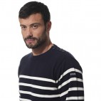 Pull ras du cou à rayures bleu marine et blanc pour hommes. Le classique marin à ne pas manquer dans votre garde-robe.