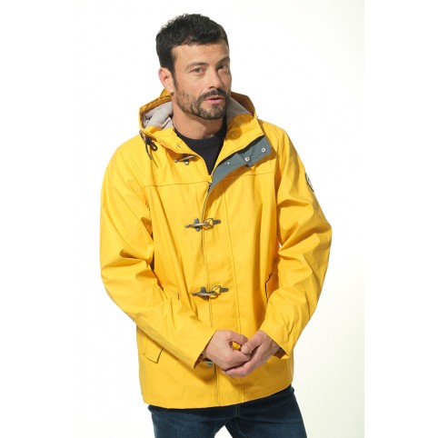 Ciré jaune doublé à l'intérieur avec jersey rayé. Léger et confortable pour un usage quotidien. Double fermeture avec fermeture éclair et boutons pression. Capuche ajustable. Les poches latérales se ferment par un zip. Composition: 100% polyuréthane.