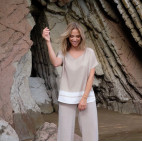 Joli T-shirt beige à manches courtes pour femme avec un effet tie dye dans le bas. T-shirt de style marin avec un élégant col en V et fabriqué dans un tissu agréable au toucher en viscose et Tencel.