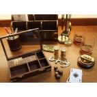 Élégante loupe avec son coffret. Loupe en laiton avec manche en bois présentée dans un coffret en bois d'acacia incrusté de motifs nautiques en laiton.