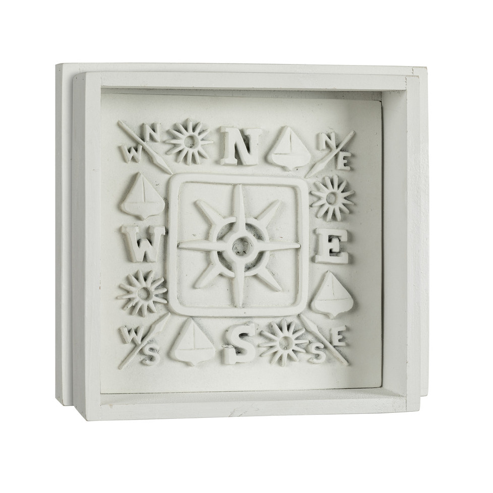 Élégant cadre en bois peint en blanc avec des figures en relief en plâtre représentant une rose des vents entourée de détails marins. Son style nautique et minimaliste en fait une pièce idéale pour apporter une touche côtière et lumineuse à votre intérieur.